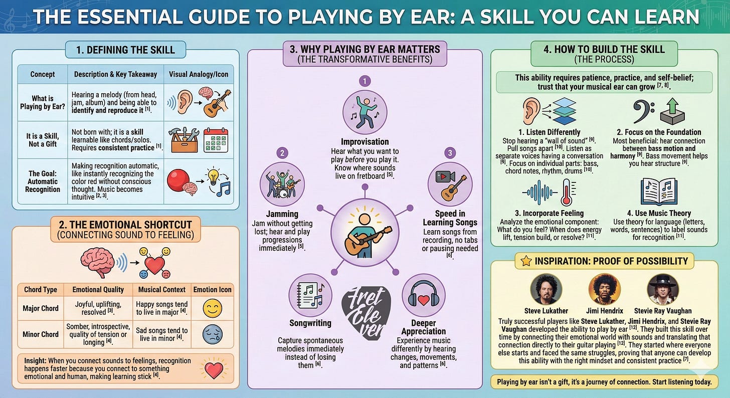 A lot of guitarists think “playing by ear” just means figuring out songs without tabs. That’s part of it, but the skill goes much deeper.