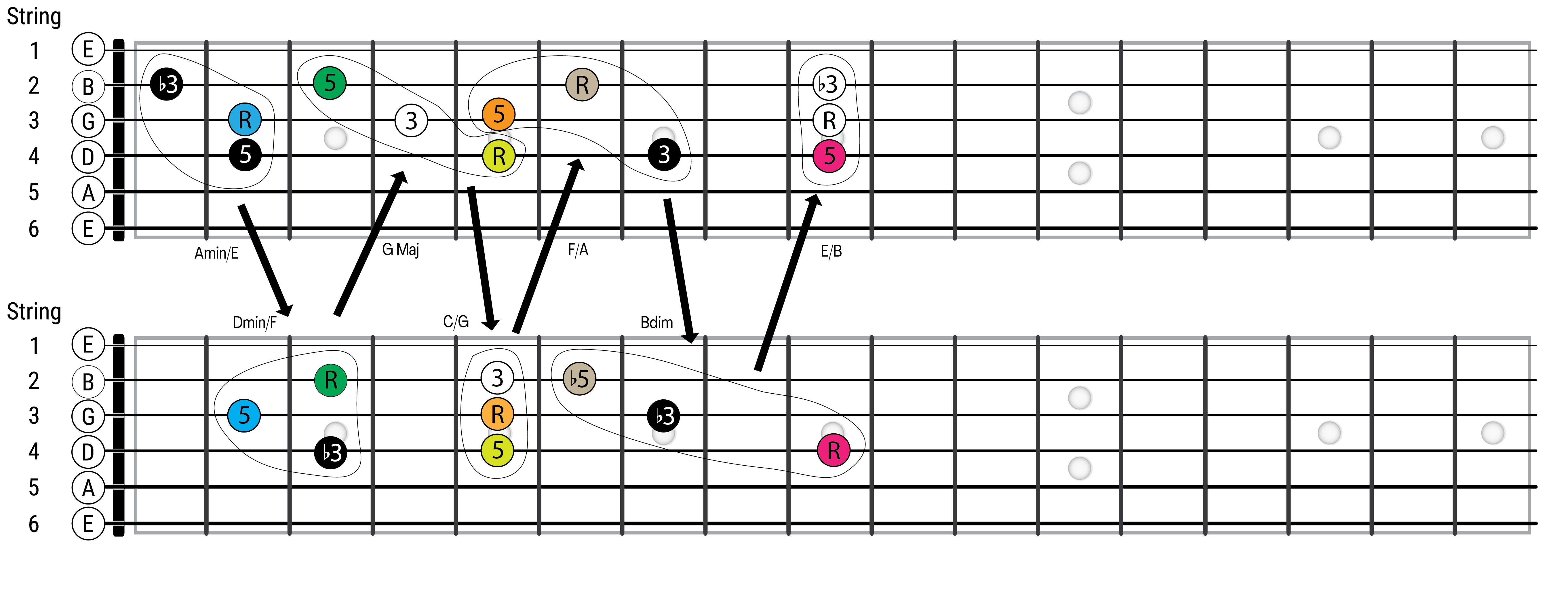 Now that you have one way of playing the progression under your belt try starting with the next Amin inversion up the neck on the same string set which would be Amin in root position.