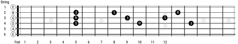 Start by learning these shapes for a G major triad. Then try the same for C major and D major. These three chords make up the I–IV–V progression in the key of G.