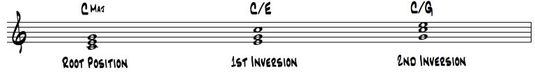 These are still C major triads, but they sound and feel different. On guitar, each inversion has its own shape. You’ll often see these used in slash chords. For example: